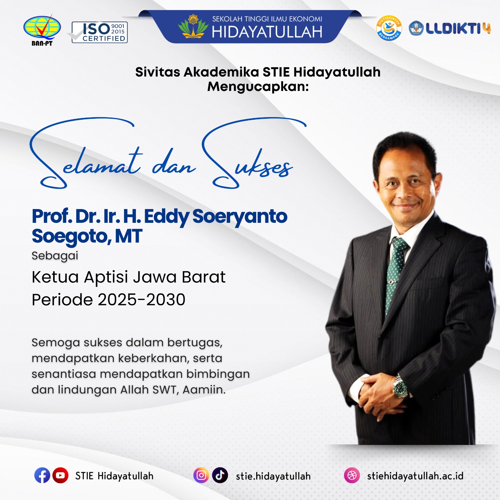 Sivitas Akademika Sekolah Tinggi Ilmu Ekonomi (STIE) Hidayatullah menyampaikan ucapan selamat dan sukses kepada Prof. Dr. Ir. H. Eddy Soeryanto Soegoto, MT atas amanah yang diemban sebagai Ketua Asosiasi Perguruan Tinggi Swasta Indonesia (Aptisi) Jawa Barat untuk periode 2025–2030.